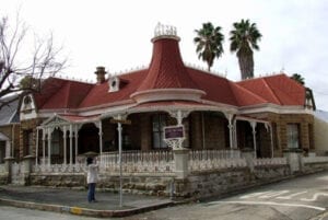 Over the years Bullock's firm and others would be responsible for a number of Oudtshoorn's famous ostrich palaces, all built in distinctive sandstone. The architecture, influenced by contemporary art-nouveau designs, was an unique eclectic mix using styles, methods and materials regardless of cost or even suitability. The resulting buildings were constructed with thick sandstone walls from local quarries, with corrugated - iron verandahs that almost encircle the houses, high ceilings, large sash windows with heavy wooden (teak!) shutters, decoration with white cast-iron lace-work brackets and railings, all contrasting the raw sandstone walls and red roofs. Quite something for a town in the middle of no-where.