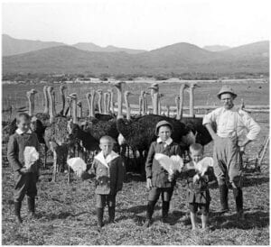 The main reason for Oudtshoorn’s quick fortune can be summed up in the unlikely form of the ostrich. The huge flightless bird, indigenous to Africa, and ideally suited to the Karoo’s dry environment, produced magnificent feathers that had become extremely popular as high fashion accessories in fin-de-siecle Britain and Europe, especially when feather trimming became de rigueur for hats and boas.
