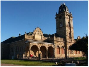 This was led by the arrival in 1903 of Charles Bullock, a British architect, who opened an office in the town. He was later joined in 1907 by a Dutch architect, Johannes Egbertus Vixeboxse. One of their first commissions from the Cape Superintendent of Education was a modern school building opened in 1907 on Baron van Rheede Street, formally Queens St. in the centre of the town. This ornate building reflects a late Victorian Colonial style of a classical building. The 30m high tower is decorated with Corinthian ornaments, with octagonal "koepel" rounded off with a green wrought iron crown. On both sides of the central clock tower the facade is symmetrically designed. Both sides end with verandas bolstered by sandstone pillars in the Tuscany building style.